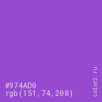 Цвет #974AD0 в цветовой модели RGB обозначается тремя октетами (151, 74, 208) в десятичном формате и #974AD0 в шестнадцатиричном (hex) формате, которые являются интенсивностью красного 151 (hex 97), интенсивность зелёного 74 (hex 4A) и интенсивность синего 208 (hex D0).