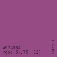 Цвет #974B84 в цветовой модели RGB обозначается тремя октетами (151, 75, 132) в десятичном формате и #974B84 в шестнадцатиричном (hex) формате, которые являются интенсивностью красного 151 (hex 97), интенсивность зелёного 75 (hex 4B) и интенсивность синего 132 (hex 84).