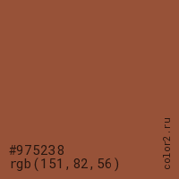 Цвет #975238 в цветовой модели RGB обозначается тремя октетами (151, 82, 56) в десятичном формате и #975238 в шестнадцатиричном (hex) формате, которые являются интенсивностью красного 151 (hex 97), интенсивность зелёного 82 (hex 52) и интенсивность синего 56 (hex 38).