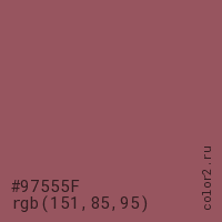 Цвет #97555F в цветовой модели RGB обозначается тремя октетами (151, 85, 95) в десятичном формате и #97555F в шестнадцатиричном (hex) формате, которые являются интенсивностью красного 151 (hex 97), интенсивность зелёного 85 (hex 55) и интенсивность синего 95 (hex 5F).