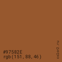 Цвет #97582E в цветовой модели RGB обозначается тремя октетами (151, 88, 46) в десятичном формате и #97582E в шестнадцатиричном (hex) формате, которые являются интенсивностью красного 151 (hex 97), интенсивность зелёного 88 (hex 58) и интенсивность синего 46 (hex 2E).