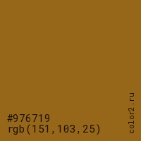 Цвет #976719 в цветовой модели RGB обозначается тремя октетами (151, 103, 25) в десятичном формате и #976719 в шестнадцатиричном (hex) формате, которые являются интенсивностью красного 151 (hex 97), интенсивность зелёного 103 (hex 67) и интенсивность синего 25 (hex 19).