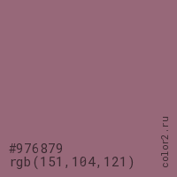 Цвет #976879 в цветовой модели RGB обозначается тремя октетами (151, 104, 121) в десятичном формате и #976879 в шестнадцатиричном (hex) формате, которые являются интенсивностью красного 151 (hex 97), интенсивность зелёного 104 (hex 68) и интенсивность синего 121 (hex 79).