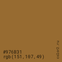 Цвет #976B31 в цветовой модели RGB обозначается тремя октетами (151, 107, 49) в десятичном формате и #976B31 в шестнадцатиричном (hex) формате, которые являются интенсивностью красного 151 (hex 97), интенсивность зелёного 107 (hex 6B) и интенсивность синего 49 (hex 31).