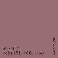 Цвет #976C72 в цветовой модели RGB обозначается тремя октетами (151, 108, 114) в десятичном формате и #976C72 в шестнадцатиричном (hex) формате, которые являются интенсивностью красного 151 (hex 97), интенсивность зелёного 108 (hex 6C) и интенсивность синего 114 (hex 72).