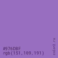 Цвет #976DBF в цветовой модели RGB обозначается тремя октетами (151, 109, 191) в десятичном формате и #976DBF в шестнадцатиричном (hex) формате, которые являются интенсивностью красного 151 (hex 97), интенсивность зелёного 109 (hex 6D) и интенсивность синего 191 (hex BF).