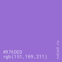 Цвет #976DD3 в цветовой модели RGB обозначается тремя октетами (151, 109, 211) в десятичном формате и #976DD3 в шестнадцатиричном (hex) формате, которые являются интенсивностью красного 151 (hex 97), интенсивность зелёного 109 (hex 6D) и интенсивность синего 211 (hex D3).