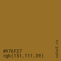 Цвет #976F27 в цветовой модели RGB обозначается тремя октетами (151, 111, 39) в десятичном формате и #976F27 в шестнадцатиричном (hex) формате, которые являются интенсивностью красного 151 (hex 97), интенсивность зелёного 111 (hex 6F) и интенсивность синего 39 (hex 27).