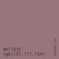 Цвет #97757C в цветовой модели RGB обозначается тремя октетами (151, 117, 124) в десятичном формате и #97757C в шестнадцатиричном (hex) формате, которые являются интенсивностью красного 151 (hex 97), интенсивность зелёного 117 (hex 75) и интенсивность синего 124 (hex 7C).