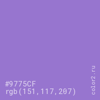 Цвет #9775CF в цветовой модели RGB обозначается тремя октетами (151, 117, 207) в десятичном формате и #9775CF в шестнадцатиричном (hex) формате, которые являются интенсивностью красного 151 (hex 97), интенсивность зелёного 117 (hex 75) и интенсивность синего 207 (hex CF).