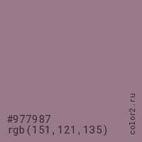 Цвет #977987 в цветовой модели RGB обозначается тремя октетами (151, 121, 135) в десятичном формате и #977987 в шестнадцатиричном (hex) формате, которые являются интенсивностью красного 151 (hex 97), интенсивность зелёного 121 (hex 79) и интенсивность синего 135 (hex 87).