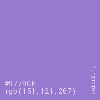 Цвет #9779CF в цветовой модели RGB обозначается тремя октетами (151, 121, 207) в десятичном формате и #9779CF в шестнадцатиричном (hex) формате, которые являются интенсивностью красного 151 (hex 97), интенсивность зелёного 121 (hex 79) и интенсивность синего 207 (hex CF).