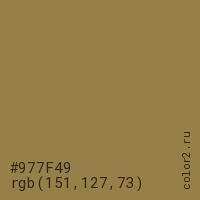 Цвет #977F49 в цветовой модели RGB обозначается тремя октетами (151, 127, 73) в десятичном формате и #977F49 в шестнадцатиричном (hex) формате, которые являются интенсивностью красного 151 (hex 97), интенсивность зелёного 127 (hex 7F) и интенсивность синего 73 (hex 49).
