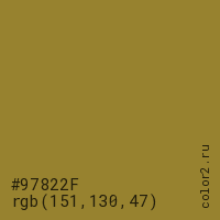 Цвет #97822F в цветовой модели RGB обозначается тремя октетами (151, 130, 47) в десятичном формате и #97822F в шестнадцатиричном (hex) формате, которые являются интенсивностью красного 151 (hex 97), интенсивность зелёного 130 (hex 82) и интенсивность синего 47 (hex 2F).