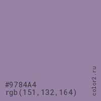 Цвет #9784A4 в цветовой модели RGB обозначается тремя октетами (151, 132, 164) в десятичном формате и #9784A4 в шестнадцатиричном (hex) формате, которые являются интенсивностью красного 151 (hex 97), интенсивность зелёного 132 (hex 84) и интенсивность синего 164 (hex A4).