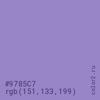 Цвет #9785C7 в цветовой модели RGB обозначается тремя октетами (151, 133, 199) в десятичном формате и #9785C7 в шестнадцатиричном (hex) формате, которые являются интенсивностью красного 151 (hex 97), интенсивность зелёного 133 (hex 85) и интенсивность синего 199 (hex C7).