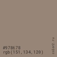 Цвет #978678 в цветовой модели RGB обозначается тремя октетами (151, 134, 120) в десятичном формате и #978678 в шестнадцатиричном (hex) формате, которые являются интенсивностью красного 151 (hex 97), интенсивность зелёного 134 (hex 86) и интенсивность синего 120 (hex 78).