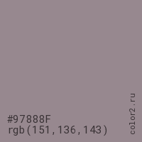Цвет #97888F в цветовой модели RGB обозначается тремя октетами (151, 136, 143) в десятичном формате и #97888F в шестнадцатиричном (hex) формате, которые являются интенсивностью красного 151 (hex 97), интенсивность зелёного 136 (hex 88) и интенсивность синего 143 (hex 8F).