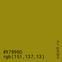 Цвет #97890D в цветовой модели RGB обозначается тремя октетами (151, 137, 13) в десятичном формате и #97890D в шестнадцатиричном (hex) формате, которые являются интенсивностью красного 151 (hex 97), интенсивность зелёного 137 (hex 89) и интенсивность синего 13 (hex 0D).