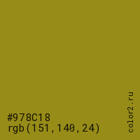 Цвет #978C18 в цветовой модели RGB обозначается тремя октетами (151, 140, 24) в десятичном формате и #978C18 в шестнадцатиричном (hex) формате, которые являются интенсивностью красного 151 (hex 97), интенсивность зелёного 140 (hex 8C) и интенсивность синего 24 (hex 18).