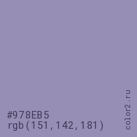 Цвет #978EB5 в цветовой модели RGB обозначается тремя октетами (151, 142, 181) в десятичном формате и #978EB5 в шестнадцатиричном (hex) формате, которые являются интенсивностью красного 151 (hex 97), интенсивность зелёного 142 (hex 8E) и интенсивность синего 181 (hex B5).