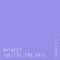 Цвет #978FE7 в цветовой модели RGB обозначается тремя октетами (151, 143, 231) в десятичном формате и #978FE7 в шестнадцатиричном (hex) формате, которые являются интенсивностью красного 151 (hex 97), интенсивность зелёного 143 (hex 8F) и интенсивность синего 231 (hex E7).