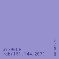 Цвет #9790CF в цветовой модели RGB обозначается тремя октетами (151, 144, 207) в десятичном формате и #9790CF в шестнадцатиричном (hex) формате, которые являются интенсивностью красного 151 (hex 97), интенсивность зелёного 144 (hex 90) и интенсивность синего 207 (hex CF).