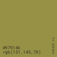 Цвет #979146 в цветовой модели RGB обозначается тремя октетами (151, 145, 70) в десятичном формате и #979146 в шестнадцатиричном (hex) формате, которые являются интенсивностью красного 151 (hex 97), интенсивность зелёного 145 (hex 91) и интенсивность синего 70 (hex 46).