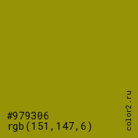 Цвет #979306 в цветовой модели RGB обозначается тремя октетами (151, 147, 6) в десятичном формате и #979306 в шестнадцатиричном (hex) формате, которые являются интенсивностью красного 151 (hex 97), интенсивность зелёного 147 (hex 93) и интенсивность синего 6 (hex 06).