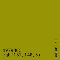 Цвет #979405 в цветовой модели RGB обозначается тремя октетами (151, 148, 5) в десятичном формате и #979405 в шестнадцатиричном (hex) формате, которые являются интенсивностью красного 151 (hex 97), интенсивность зелёного 148 (hex 94) и интенсивность синего 5 (hex 05).