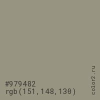 Цвет #979482 в цветовой модели RGB обозначается тремя октетами (151, 148, 130) в десятичном формате и #979482 в шестнадцатиричном (hex) формате, которые являются интенсивностью красного 151 (hex 97), интенсивность зелёного 148 (hex 94) и интенсивность синего 130 (hex 82).