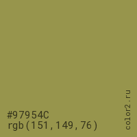Цвет #97954C в цветовой модели RGB обозначается тремя октетами (151, 149, 76) в десятичном формате и #97954C в шестнадцатиричном (hex) формате, которые являются интенсивностью красного 151 (hex 97), интенсивность зелёного 149 (hex 95) и интенсивность синего 76 (hex 4C).