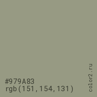 Цвет #979A83 в цветовой модели RGB обозначается тремя октетами (151, 154, 131) в десятичном формате и #979A83 в шестнадцатиричном (hex) формате, которые являются интенсивностью красного 151 (hex 97), интенсивность зелёного 154 (hex 9A) и интенсивность синего 131 (hex 83).