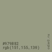 Цвет #979B82 в цветовой модели RGB обозначается тремя октетами (151, 155, 130) в десятичном формате и #979B82 в шестнадцатиричном (hex) формате, которые являются интенсивностью красного 151 (hex 97), интенсивность зелёного 155 (hex 9B) и интенсивность синего 130 (hex 82).