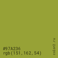 Цвет #97A236 в цветовой модели RGB обозначается тремя октетами (151, 162, 54) в десятичном формате и #97A236 в шестнадцатиричном (hex) формате, которые являются интенсивностью красного 151 (hex 97), интенсивность зелёного 162 (hex A2) и интенсивность синего 54 (hex 36).