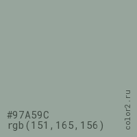 Цвет #97A59C в цветовой модели RGB обозначается тремя октетами (151, 165, 156) в десятичном формате и #97A59C в шестнадцатиричном (hex) формате, которые являются интенсивностью красного 151 (hex 97), интенсивность зелёного 165 (hex A5) и интенсивность синего 156 (hex 9C).