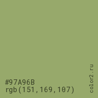 Цвет #97A96B в цветовой модели RGB обозначается тремя октетами (151, 169, 107) в десятичном формате и #97A96B в шестнадцатиричном (hex) формате, которые являются интенсивностью красного 151 (hex 97), интенсивность зелёного 169 (hex A9) и интенсивность синего 107 (hex 6B).