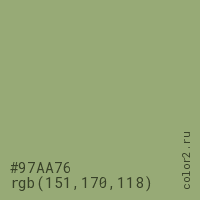 Цвет #97AA76 в цветовой модели RGB обозначается тремя октетами (151, 170, 118) в десятичном формате и #97AA76 в шестнадцатиричном (hex) формате, которые являются интенсивностью красного 151 (hex 97), интенсивность зелёного 170 (hex AA) и интенсивность синего 118 (hex 76).