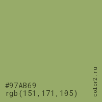 Цвет #97AB69 в цветовой модели RGB обозначается тремя октетами (151, 171, 105) в десятичном формате и #97AB69 в шестнадцатиричном (hex) формате, которые являются интенсивностью красного 151 (hex 97), интенсивность зелёного 171 (hex AB) и интенсивность синего 105 (hex 69).