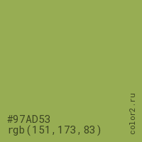 Цвет #97AD53 в цветовой модели RGB обозначается тремя октетами (151, 173, 83) в десятичном формате и #97AD53 в шестнадцатиричном (hex) формате, которые являются интенсивностью красного 151 (hex 97), интенсивность зелёного 173 (hex AD) и интенсивность синего 83 (hex 53).