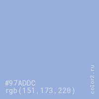 Цвет #97ADDC в цветовой модели RGB обозначается тремя октетами (151, 173, 220) в десятичном формате и #97ADDC в шестнадцатиричном (hex) формате, которые являются интенсивностью красного 151 (hex 97), интенсивность зелёного 173 (hex AD) и интенсивность синего 220 (hex DC).