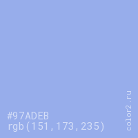 Цвет #97ADEB в цветовой модели RGB обозначается тремя октетами (151, 173, 235) в десятичном формате и #97ADEB в шестнадцатиричном (hex) формате, которые являются интенсивностью красного 151 (hex 97), интенсивность зелёного 173 (hex AD) и интенсивность синего 235 (hex EB).