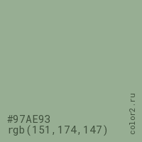 Цвет #97AE93 в цветовой модели RGB обозначается тремя октетами (151, 174, 147) в десятичном формате и #97AE93 в шестнадцатиричном (hex) формате, которые являются интенсивностью красного 151 (hex 97), интенсивность зелёного 174 (hex AE) и интенсивность синего 147 (hex 93).