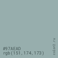 Цвет #97AEAD в цветовой модели RGB обозначается тремя октетами (151, 174, 173) в десятичном формате и #97AEAD в шестнадцатиричном (hex) формате, которые являются интенсивностью красного 151 (hex 97), интенсивность зелёного 174 (hex AE) и интенсивность синего 173 (hex AD).