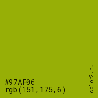 Цвет #97AF06 в цветовой модели RGB обозначается тремя октетами (151, 175, 6) в десятичном формате и #97AF06 в шестнадцатиричном (hex) формате, которые являются интенсивностью красного 151 (hex 97), интенсивность зелёного 175 (hex AF) и интенсивность синего 6 (hex 06).