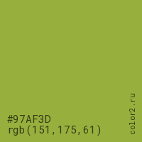 Цвет #97AF3D в цветовой модели RGB обозначается тремя октетами (151, 175, 61) в десятичном формате и #97AF3D в шестнадцатиричном (hex) формате, которые являются интенсивностью красного 151 (hex 97), интенсивность зелёного 175 (hex AF) и интенсивность синего 61 (hex 3D).