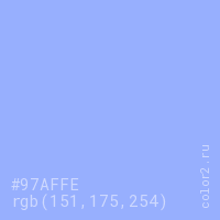 Цвет #97AFFE в цветовой модели RGB обозначается тремя октетами (151, 175, 254) в десятичном формате и #97AFFE в шестнадцатиричном (hex) формате, которые являются интенсивностью красного 151 (hex 97), интенсивность зелёного 175 (hex AF) и интенсивность синего 254 (hex FE).