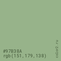 Цвет #97B38A в цветовой модели RGB обозначается тремя октетами (151, 179, 138) в десятичном формате и #97B38A в шестнадцатиричном (hex) формате, которые являются интенсивностью красного 151 (hex 97), интенсивность зелёного 179 (hex B3) и интенсивность синего 138 (hex 8A).