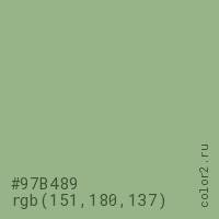 Цвет #97B489 в цветовой модели RGB обозначается тремя октетами (151, 180, 137) в десятичном формате и #97B489 в шестнадцатиричном (hex) формате, которые являются интенсивностью красного 151 (hex 97), интенсивность зелёного 180 (hex B4) и интенсивность синего 137 (hex 89).
