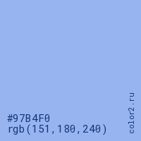Цвет #97B4F0 в цветовой модели RGB обозначается тремя октетами (151, 180, 240) в десятичном формате и #97B4F0 в шестнадцатиричном (hex) формате, которые являются интенсивностью красного 151 (hex 97), интенсивность зелёного 180 (hex B4) и интенсивность синего 240 (hex F0).